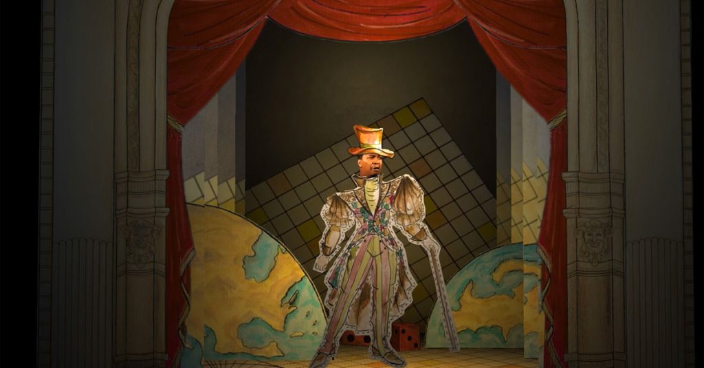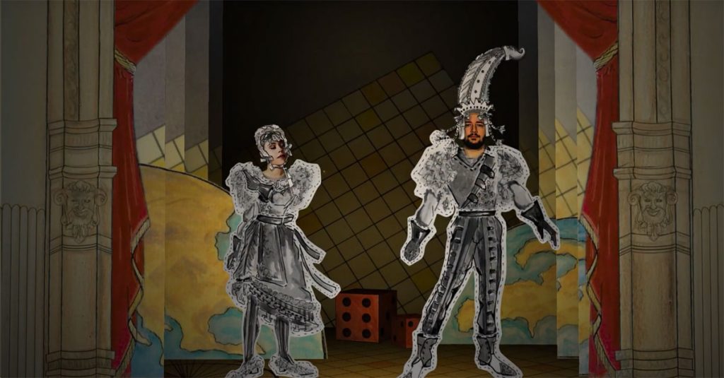 Diante de um contexto de pandemia, o projeto de cenografia para a ópera La Cambiale di Matrimonio de Gioachino Rossini, que inicialmente seria realizado de forma presencial na Escola de Música da UFRJ, transformou-se na construção de uma ópera remota. A metodologia de trabalho das equipes de Cenografia e Figurino foi alterada para privilegiar o desenvolvimento de uma estética para uma ópera digital. A partir da análise do libreto e pesquisa dos componentes teóricos e musicais da ópera, foi desenvolvido um conceito artístico que rompeu com a concepção realista, utilizando como referências mapas navais antigos e o universo dos jogos de tabuleiro, traçando um paralelo da estética destes com o contexto da farsa. Para o projeto virtual, foi realizada uma releitura dos Teatros de Brinquedo do século XIX, mantendo a mesma cenografia concebida para a encenação física. A proposta prevê as diversas cenas da ópera apresentadas em um teatro de papel digitalizado, com a inserção das personagens como figuras bidimensionais que remetem às “bonecas de papel” dos Toy Theatres. Para a parte frontal do Teatro de Brinquedo, foram revisitados elementos arquitetônicos da fachada do edifício da Escola de Música da UFRJ, mesclados com elementos da boca de cena do palco da Sala Leopoldo Miguez. Os desenhos de figurinos se transformaram em “roupas de papel”, aplicadas em personagens com os rostos do elenco. A característica artesanal que permeia as realizações cênicas do Projeto Ópera na UFRJ foi mantida no traço do lápis sobre papel: todas as imagens que aparecem na ópera digital, com exceção dos rostos dos interpretes inseridos nos personagens, foram desenhadas à mão, coloridas com aquarela e nanquim e posteriormente digitalizadas.